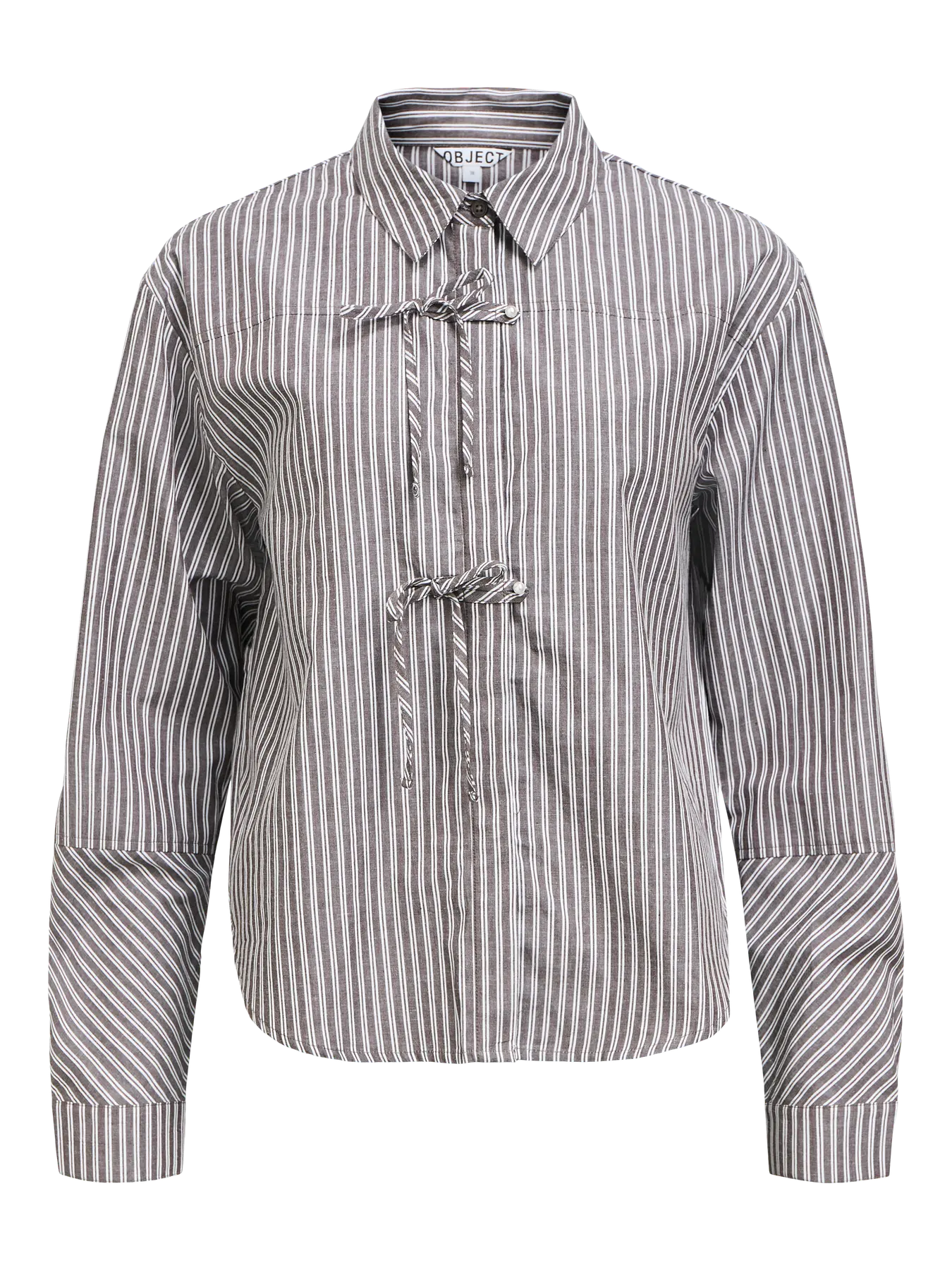Preciosa camisa de rayas con fondo marrón clarito detalle de cierre de botón perla con detalle de adorno de lazo. Corte regular, si estas entre dos tallas elige la pequeña