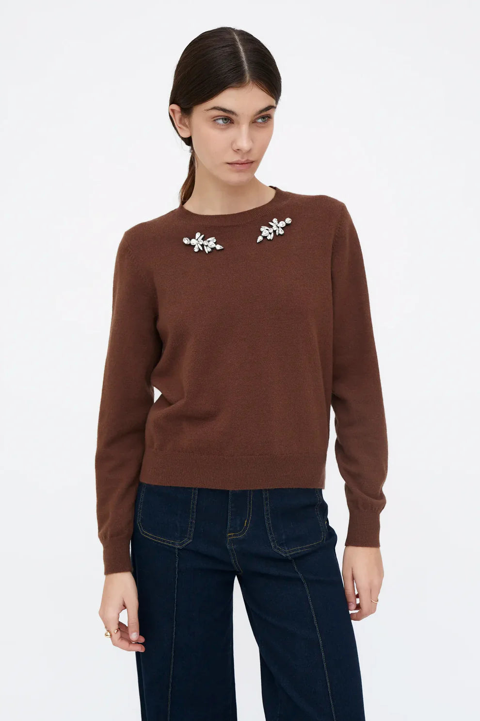 Jersey punto suave de color marrón con aplique joya. Cuello redondo y manga larga con detalles en ribete