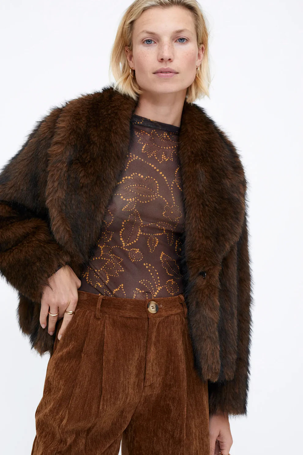 Top malla con estampado Mustard Flower. Cuello barco y manga larga.